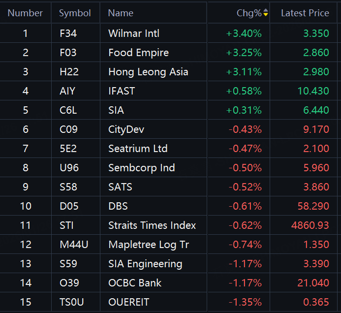 The Straits Times Index (STI), a key benchmark for the Singapore Exchange, ranged between 4,854.05 and 4,898.14 throughout the day. It ended the session at 4,860.93, down 30.52 points or 0.6% compared to Friday's close.