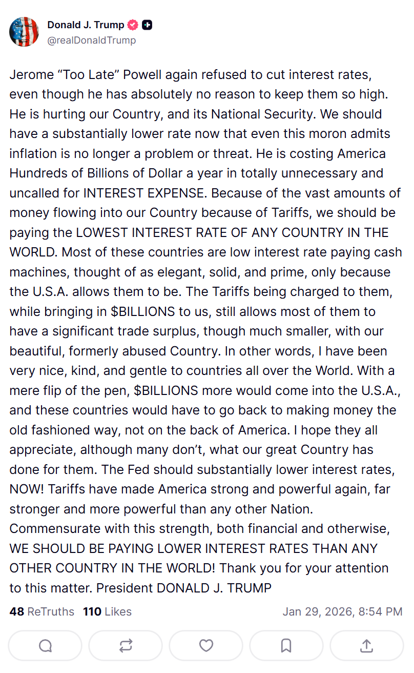 WASHINGTON, Jan 29 (Reuters) - The U.S. should have substantially lower interest rates now and should have the lowest in the world, President Donald Trump on Thursday, one day after the U.S. Federal Reserve moved to hold benchmark rates steady.