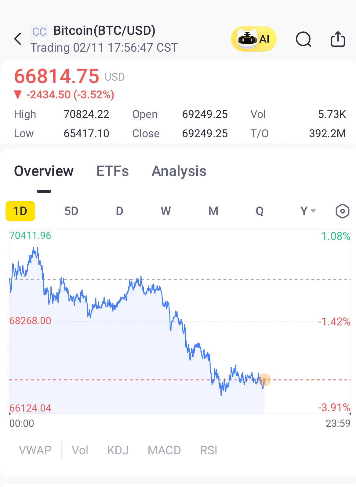 Bitcoin (BTCUSD) was trading down 3.5%, or $2,434, to $66,814.
