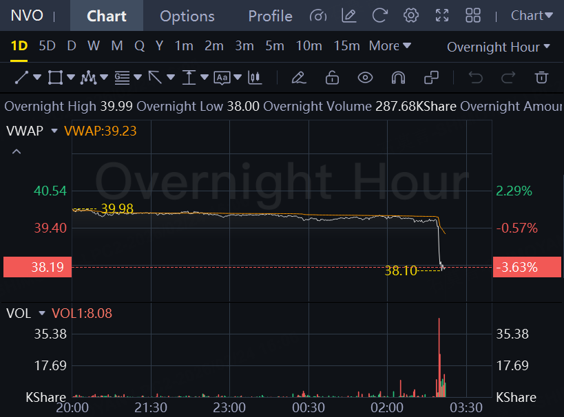 Novo Nordisk shares fell another 3.6% in overnight trading after closing 16% lower on Monday.