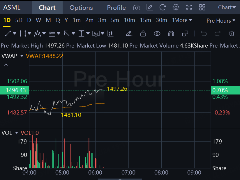 ASML Holding shares were up 0.7% at $1496.43 during premarket trading on Tuesday.