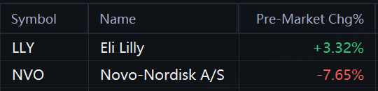 Novo Nordisk shares sank 7.7% in premarket trading, while Eli Lilly gained 3.3%.