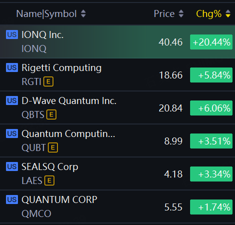 Other quantum computing also jumped. Rigetti Computing, D-Wave Quantum up around 6%; Quantum Computing, SEALSQ up over 3%.