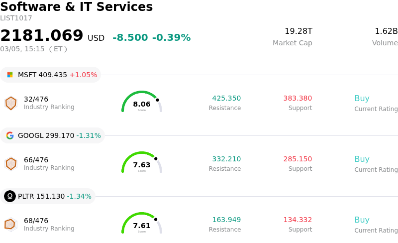 International Business Machines Corp (IBM) moved up by 3.20%. The Software & IT Services sector is down by 0.39%. The company outperformed the industry. Top 3 stocks by trading volume in the sector: Microsoft Corp (MSFT) up 1.05%; Alphabet Inc Class A (GOOGL) down 1.31%; Palantir Technologies Inc (PLTR) down 1.34%.