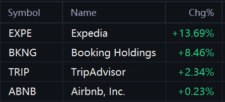 Shares of Expedia were up 13.7%, while Booking Holdings and Tripadvisor rose 8.5% and 2.3%, respectively.