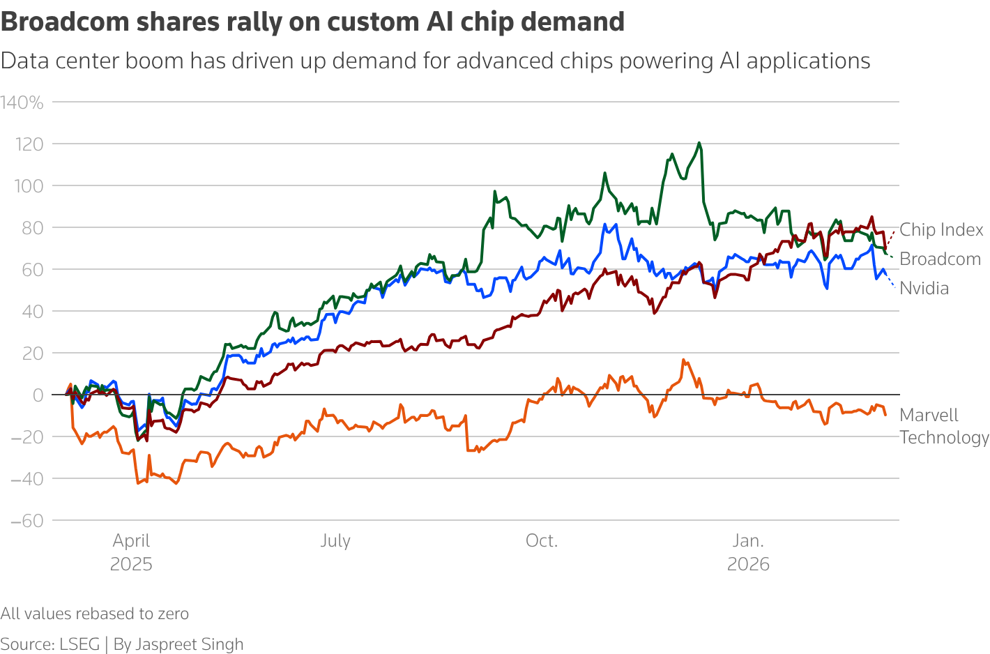 Big Tech firms such as Alphabet, Microsoft, Amazon and Meta are expected to spend at least $630 billion to build AI infrastructure this year, which would boost demand for chips, servers, storage and networking equipment from companies like Broadcom.