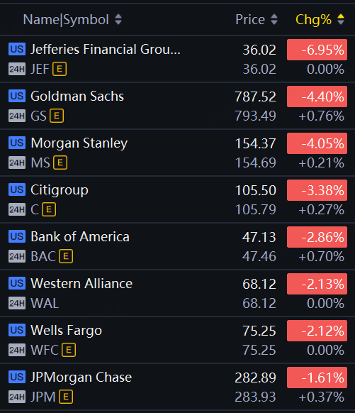Bank stocks slid on the news. Jefferies down 7%; Goldman, Morgan Stanley fell around 4%.