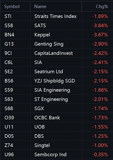The Straits Times Index (STI), a key benchmark for the Singapore Exchange, ranged between 4,697.52 and 4,778.38 throughout the day. It ended the session at 4,756.61, down 91.64 points or 1.9% compared to Friday's close.