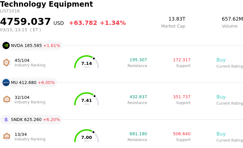 Arm Holdings PLC (ARM) moved up by 3.96%. The Technology Equipment sector is up by 1.34%. The company outperformed the industry. Top 3 stocks by turnover in the sector: NVIDIA Corp (NVDA) up 1.61%; Micron Technology Inc (MU) up 6.00%; SanDisk Corporation (SNDK) up 6.20%.
