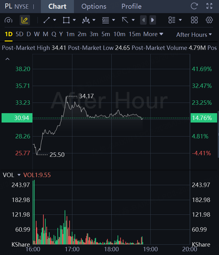 Shares $(PL)$ were up 15% in Thursday's extended session, after surging 535% in the 12 months through Thursday's close.