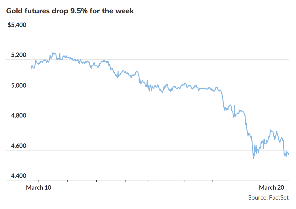 Gold prices posted their largest weekly percentage drop in more than 14 years Friday, underscoring how shocks from the Iran conflict are unleasing havoc in markets, even for traditional safe-haven assets.
