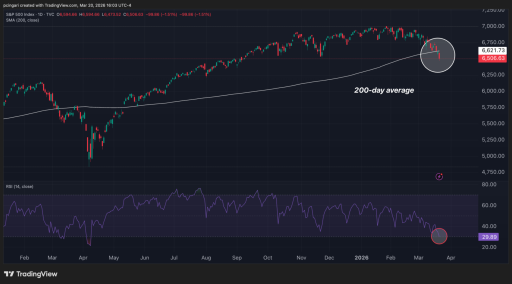 The S&P 500’s 14-day RSI dropped below 30 for the first time since the April 2025 tariff shock — crossing into oversold territory as selling pressure showed no sign of letting up.