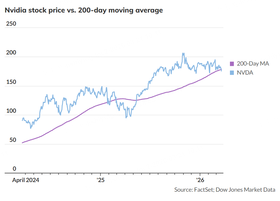 It’s an unusual move for Nvidia, which has been the leader of the AI trade. Through Thursday, Nvidia’s stock had closed above the 200-day moving average for 214 straight trading days, according to Dow Jones Market Data. The DeepSeek scare and uncertainty about tariffs caused shares to slip below the line from January to May of last year — but prior to that, Nvidia had closed above the 200-day moving average for a record of 509 straight days.