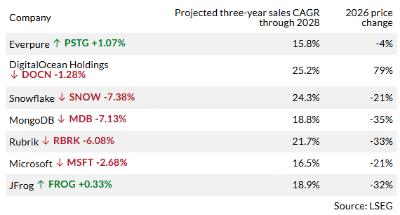 Here are the projected compound annual growth rates (CAGR) for revenue for the seven infrastructure software companies the William Blair team rated "outperform." These projections are based on consensus estimates for calendar-year revenue through 2028 among analysts working for brokerage and research firms polled by LSEG. The table also includes this year's price changes for the stocks through Monday. The seven companies are sorted by the William Blair analysts' score ranking.