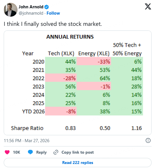 In a post on the social media service X, Arnold showed that a portfolio equal-weighted to the technology XLK and energy XLE sectors not only has posted double-digit returns in six of the last seven years, but done so when adjusted for risk. A Sharpe ratio measures an investment's return per unit of risk, so any number above 1 is considered good, and he calculates his portfolio had a ratio of 1.16.