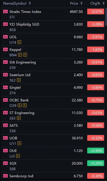 STI down 0.6%; YZJ Shipbldg, UOL down 3%; Keppel down 2%; Seatrium, OCBC, Singtel down 1%.
