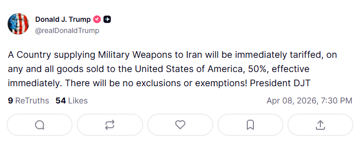 A Country supplying Military Weapons to Iran will be immediately tariffed, on any and all goods sold to the United States of America, 50%, effective immediately. There will be no exclusions or exemptions! President DJT