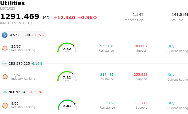 Ge Vernova Inc (GEV) moved up by 3.15%. The Utilities sector is up by 0.96%. The company outperformed the industry. Top 3 stocks by turnover in the sector: Ge Vernova Inc (GEV) up 3.15%; Constellation Energy Corp (CEG) down 6.16%; $Nextera Energy Inc(NEE-N)$ (NEE) up 0.53%.