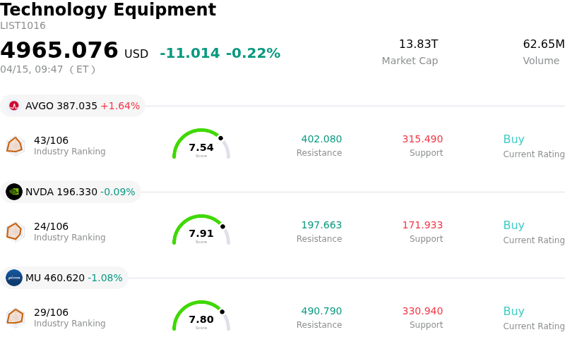 ASML Holding NV (ASML) opened down by 3.31%. The Technology Equipment sector is down by 0.22%. The company underperformed the industry. Top 3 stocks by turnover in the sector: Broadcom Inc (AVGO) up 1.64%; NVIDIA Corp (NVDA) down 0.09%; Micron Technology Inc (MU) down 1.08%.