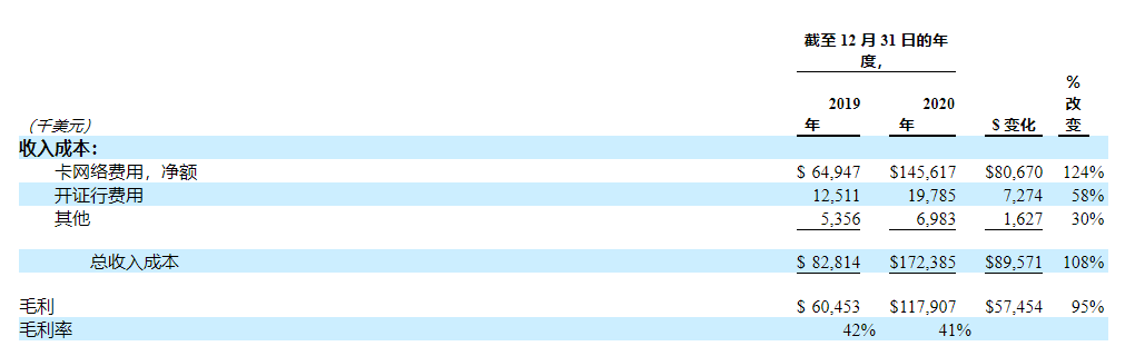 雖然公司招股書沒說具體的費用抽成,但在2020年 3 月,老闆曾告訴媒體,按需交付交易的數量在三個月內增加了兩倍,每筆都爲他的公司賺錢。該公司表示,處理政府刺激付款可能有助於將 Marqeta 的收入提高到 2021 年第一季度的 1.08 億美元,就招股書來說,老闆的預期確實在今年達到了。