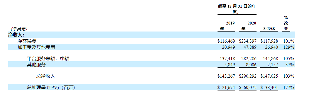 截至2019年12月31日和2020年12月31日止年度,公司的總淨收入分別爲1.433億美元和2.903億美元,增長103%,其中 Square 產生了 1.177 億美元。這一增長主要是由於 TPV 增長了 177%。這一增長是由於 Square 產生的處理量增加了 170%,以及所有其他程序(不包括 Square)產生的處理量增加了 188%。截至 2019 年 12 月 31 日和 2020 年的每個年度公司實現了超過 200% 的以美元爲基礎的淨收入保留率,說實話,我是第一次見這麼高的公司。