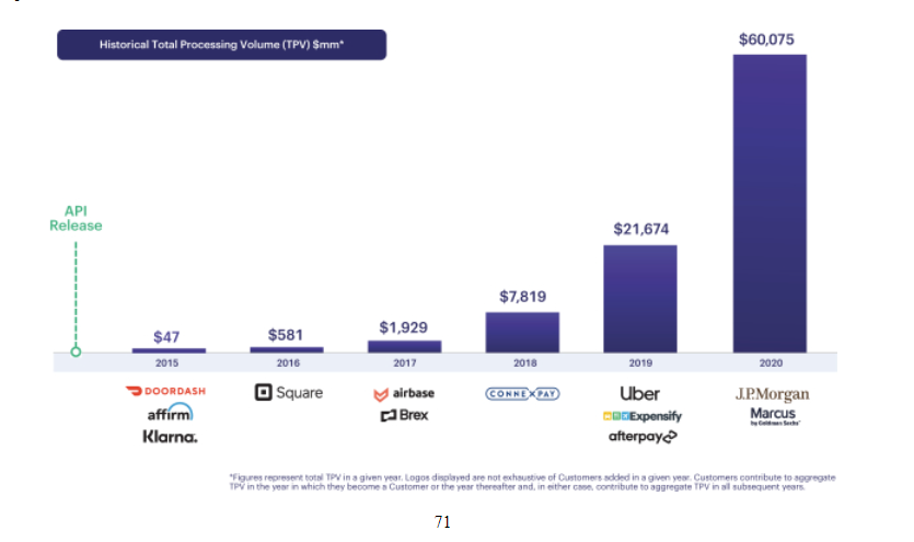 2020 年,Marqeta 平臺處理了 601 億美元的 TPV(總處理量),比上一年的 217 億美元增長了 177%。Marqeta 已經成爲許多顛覆性垂直領域的髮卡平臺類別領導者,包括按需交付、替代貸款、費用管理、支付、數字彙款和數字銀行。Marqeta的平臺受到大型金融機構的青睞,以改善他們現有的產品,並在以技術爲中心的新市場進入者中保持競爭力。