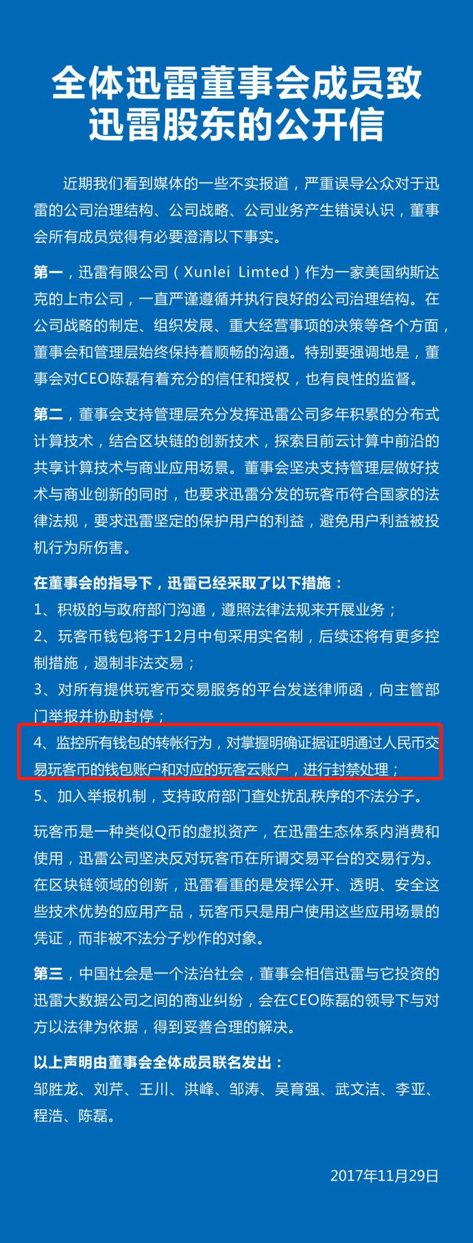 在互金協會點名迅雷“變相ICO”之後,迅雷不得不控制鏈克和玩客雲設備價格以降低社會影響。如我之前文章所說,迅雷對每個鏈克賬戶擁有完全的控制權,由此可推知,迅雷對鏈克的二級市場價格也擁有極高的控制力。2017年11月29日迅雷通過官方微博公開的《全體迅雷董事會成員致迅雷股東的公開信》承諾過“對掌握明確證據證明通過人民幣交易玩客幣的錢包賬戶和對應的玩客雲賬戶,進行封禁處理”。