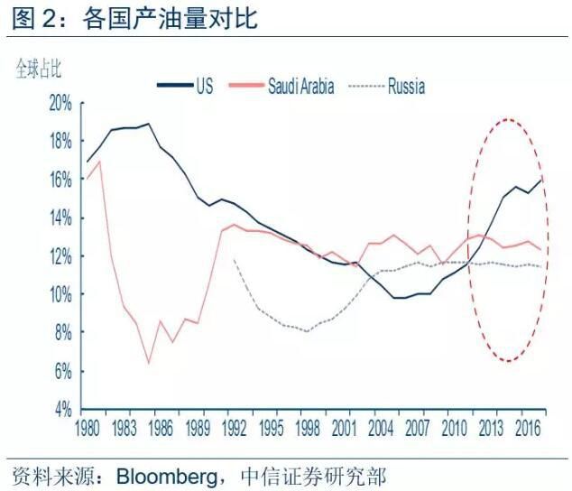 2007年,美國原油產量佔全球比例結束了長達20年的下跌開始掉頭向上。2013年,美國產油全球佔比超過俄羅斯、沙特跌居全球第一位。2017年全球佔比已達16%。與此同時,沙特、俄羅斯的佔比維持在12%-13%。