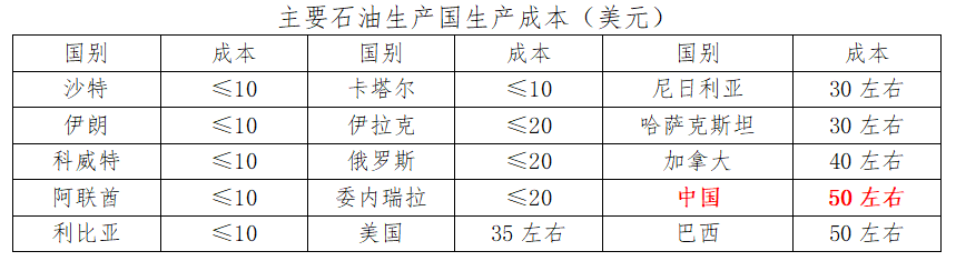 全球主要石油生產國中,中東國家石油生產綜合成本最低,沙特、伊朗、科威特、阿聯酋、利比亞、卡塔爾等國石油生產成本不到10美元。俄羅斯、委內瑞拉、伊拉克等產油大國石油生產成本也不足20美元。而中國石油生產成本最高,達到50美元。