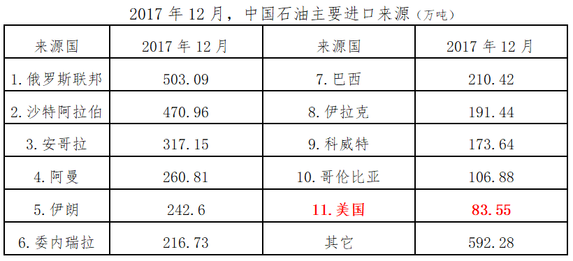 (3)2017年12月,美國成爲中國石油進口第11大來源國
