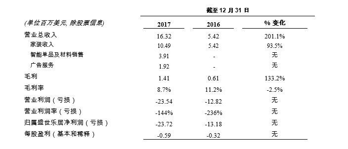 · 2017年度歸屬盛世樂居淨虧損總計2372萬美元,基本和稀釋每股虧損0.59美元,對比2016年歸屬盛世樂居淨虧損爲1318萬美元,基本和稀釋每股虧損0.32美元。虧損主要是因爲盛世樂居正快速擴張中,因此建立更多分公司導致額外租金及運營支出及銷售隊伍擴充的相關費用。2017年度的重要開支還包括了2017年第二季度爲智能整體家裝新產品發佈而投入的大規模廣告和推廣工作,以及智能單品研發隊伍的擴充和研發費用的投入,用以擴充智能單品產品線並通過線上和分銷商渠道銷售。