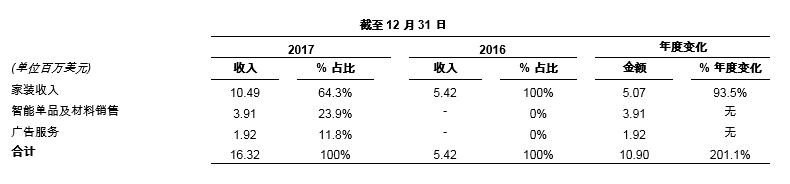 2017年6月之前,公司的收入全部來源於家裝收入。從2017年6月開始,公司開始進行智能單品和材料的銷售以及爲其他商戶進行廣告推廣服務,截至2017年底,分別產生391萬美元和192萬美元收入。