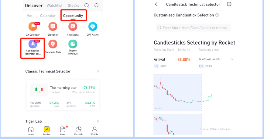 Candlestick Technical selector: [Quotes] - [Discover] - [Opportunity]. If you are a trader who enjoys technical analysis, don't miss out on this feature!