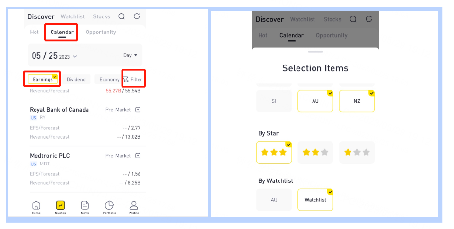 Earnings Calendar: [Quotes] - [Discover] - [Calendar]. You can also filter them based on your watchlist, region, and importance level!