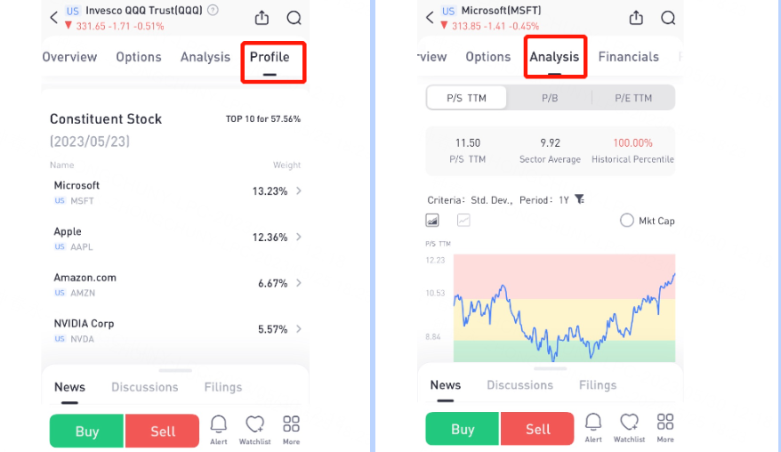 In the stock quotes section, you can easily view information such as dividend yield, price-to-earnings ratio, and more. In the ETF quotes section, the “profile” page allows you to see the constituents of the ETF at a glance.