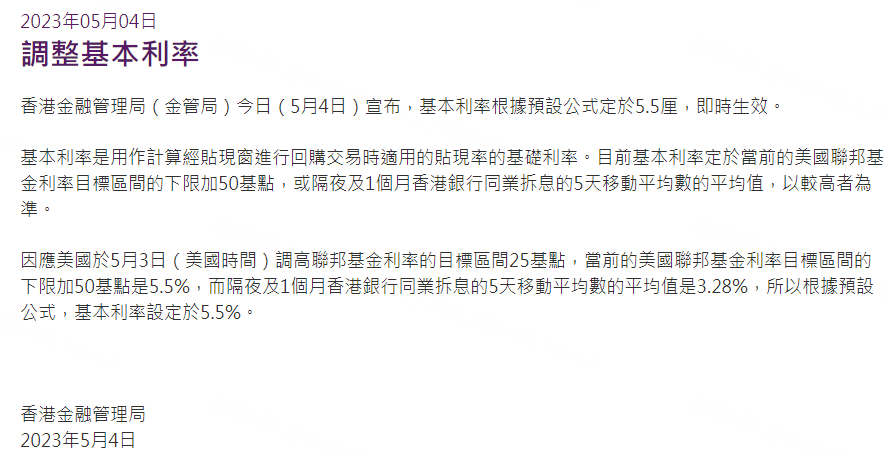 1)基準利率(Base rate):香港金管局貼現窗口提供的隔夜港元流動性貼現率。在聯系匯率制度下,金管局放棄貨幣政策獨立性,該基準利率緊跟美聯儲,一般高出聯邦基金利率下限50bp。下圖為5月4日跟隨美聯儲加息,基準利率設定為5.5%的聲明。