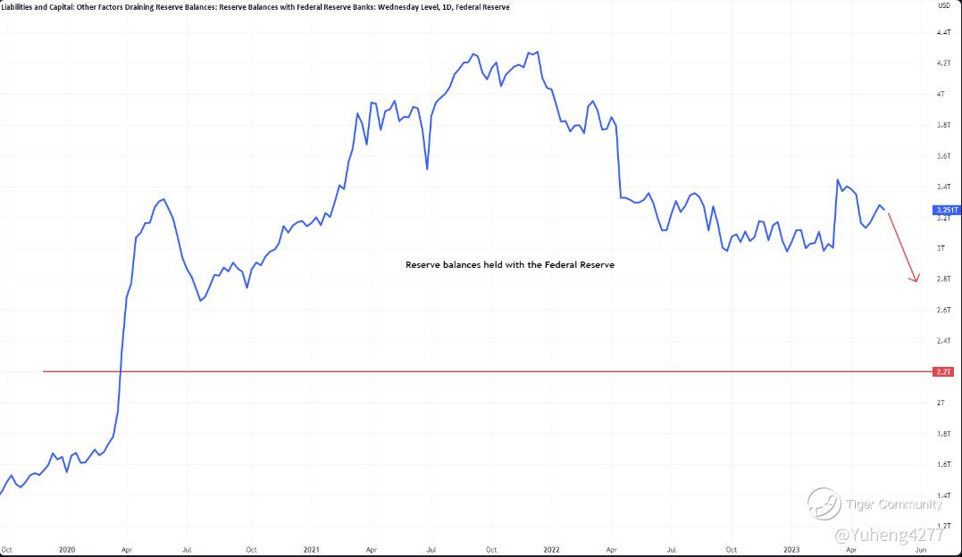 There are currently $3.28t of excess bank reserves parked on the Fed's balance sheet - so if we were to see a $500b drawdown in reserves then this balance would fall quite rapidly to around $2.8t.