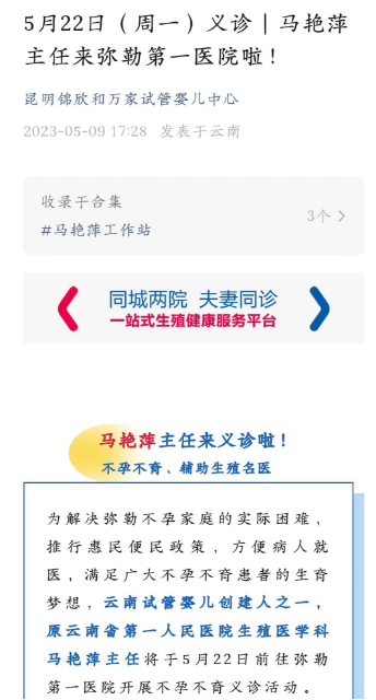 爲解決彌勒不孕家庭的實際困難,推行惠民便民政策,方便病人就醫,滿足廣大不孕不育患者的生育夢想,5月22日,雲南試管嬰兒創建人之一、原雲南省第一人民醫院生殖醫學科馬豔萍主任前往彌勒第一醫院開展不孕不育義診活動,助力好孕前行。