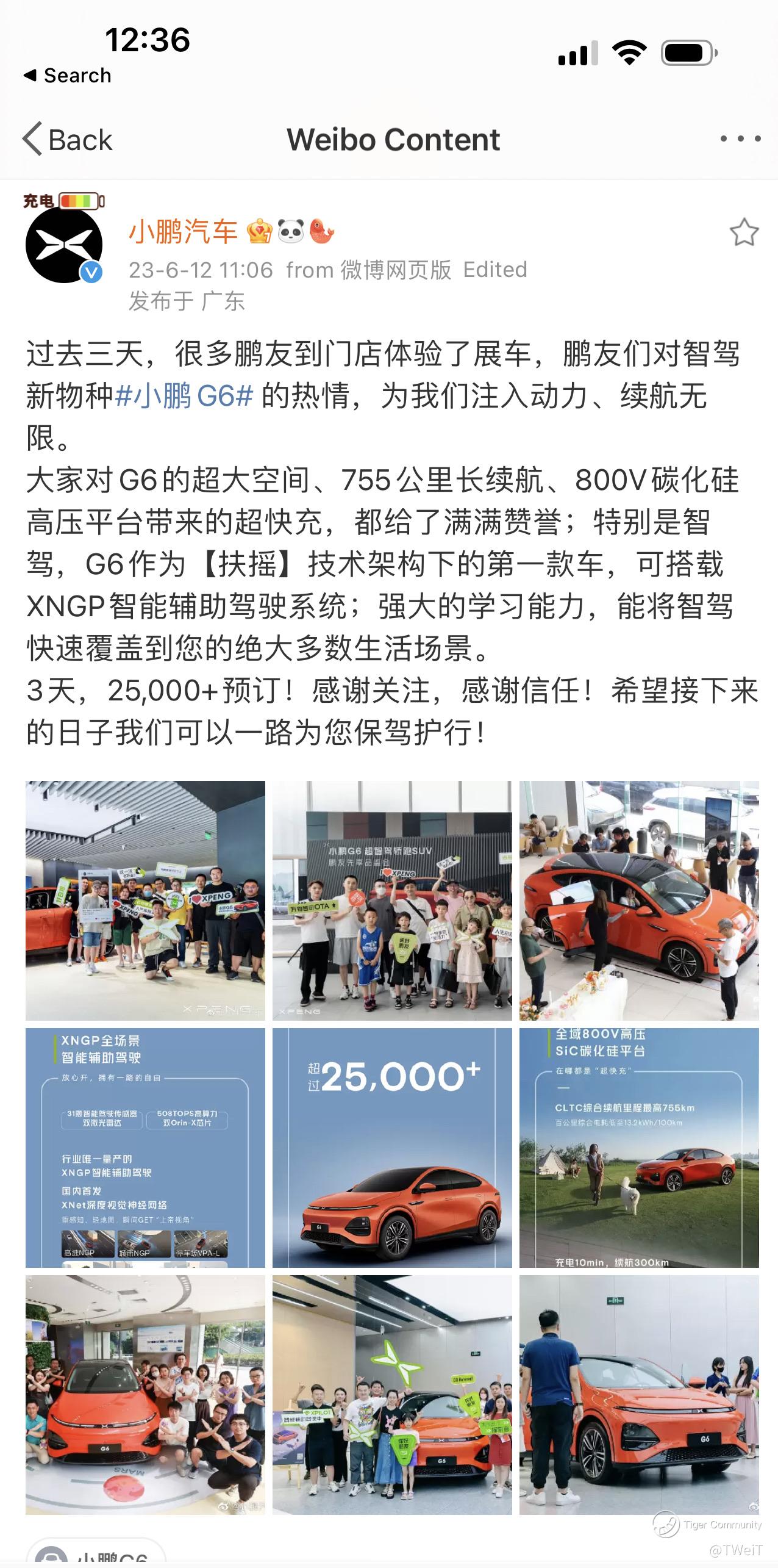 $XPeng Inc.(XPEV)$ Pre-sales of G6 achieved 25,000+ in 72 hours. Expected final price is to be lower than RMB $225k. G6 is a on the way to achieve 30k target by end of June. Now need to see how fast are the deliveries and gross margins.