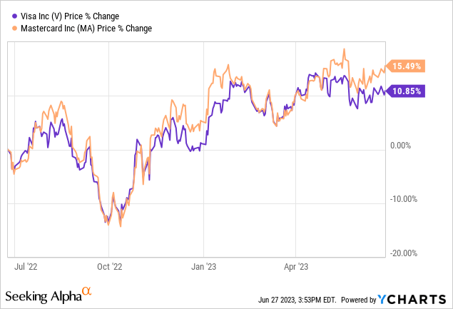 These charts virtually mimic one another over a one-year period with Mastercard outperforming by about 5% over this duration.