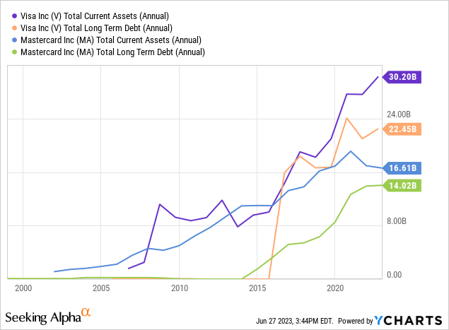 The interest coverage ratio on both are large and immaterial to the functioning of the businesses. However, the coverage ratio can show who is more levered up. The margin between LT debt and current assets is much thinner for Mastercard. More debt seems to be deployed towards buybacks in the case of Mastercard as well.