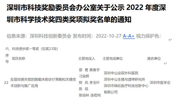 深圳中山泌尿外科醫院、深圳中山生殖與遺傳研究所、深圳市錦欣醫療科技創新中心有限公司以《反覆妊娠失敗的圍着牀期診療策略和關鍵技術創新與推廣應用》項目獲得深圳市科技進步一等獎;