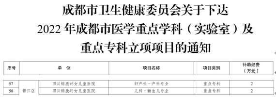 四川錦欣西囡婦女兒童醫院靜秀院區獲得成都市衛生健康委“新生兒科重點專科”、成都市衛生健康委“產科重點專科”立項,獲得“錦江區危重症孕產婦救治中心”掛牌;