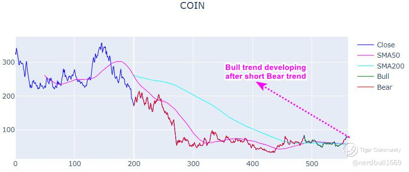 In this article, I shall examine $Coinbase Global, Inc.(COIN)$ technical analysis using SMA, ADX, RSI and SAR to see if COIN does show us signs of a developing bullish trend.
