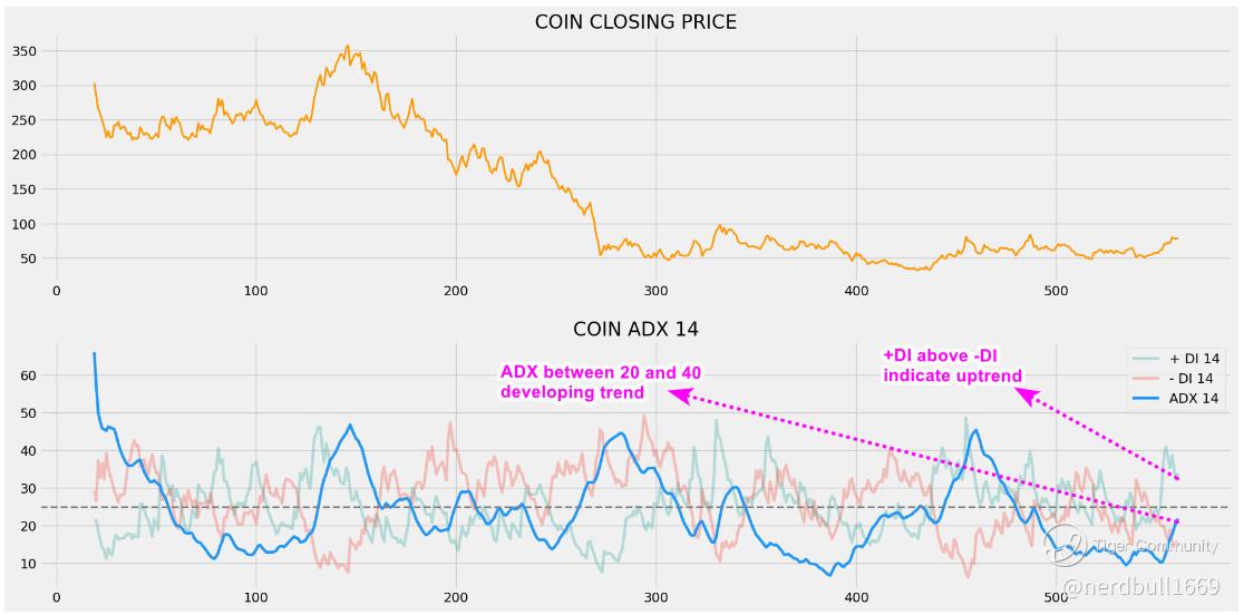 ADX show that COIN is in a developing trend(which should relate to a bullish cycle coming) and +DI above -DI indicate that this is an uptrend.