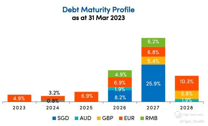 The company has negligible credit risk with diversified debt across five currencies. Gearing is manageable at 36.8% aggregate leverage, anchored by low cost of debt at 2.8%. Its weighted average debt tenor is at 3.8 years, with the bulk of debt expiring beyond 2026.