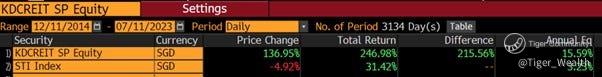 KDCREIT has done remarkably well, generating returns of 2.5x in less than 10 years. It has outperformed the STI Index by 216%. This is an amazing feat, considering KDCREIT is a dividend stock, and not a growth stock.