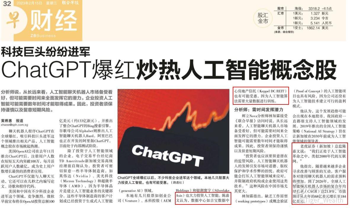 Early this year, with high interest surrounding ChatGPT, I was asked in an Lianhe Zaobao newspaper interview about AI-related stocks in Singapore. I immediately mentioned KDCREIT $KEPPEL DC REIT(AJBU.SI)$ .