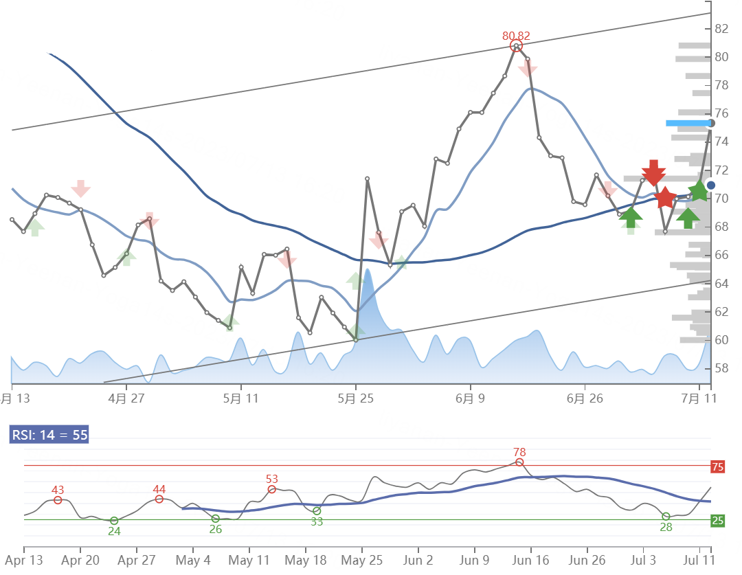 The Pinduoduo $Pinduoduo Inc.(PDD)$ stock price gained 6.05% on Wednesday, 12th Jul 2023, rising from $71.04 to $75.34. It has now gained 4 days in a row. It will be exciting to see whether it manages to continue gaining or take a minor break for the next few days. During the last trading day the stock fluctuated 4.25% from a day low at $72.64 to a day high of $75.73. The price has risen in 7 of the last 10 days and is up by 5.11% over the past 2 weeks. Volume has increased on the last day along with the price, which is a positive technical sign, and, in total, 8 million more shares were traded than the day before. In total, 14 million shares were bought and sold for approximately $1.08 billion.