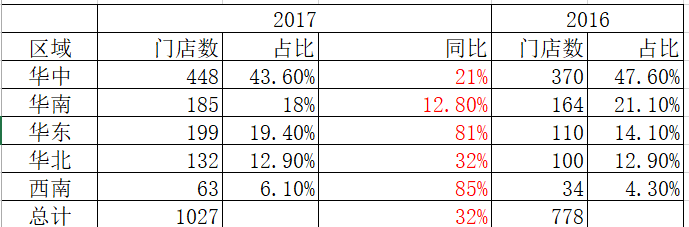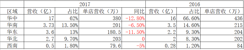 看到問題所在了吧,門店數量大肆擴張的結果是單店營收下滑,除了華北地區的單店營收持平,其他地區的單店營收均出現不同程度的下降,華中和華東下滑尤其明顯。